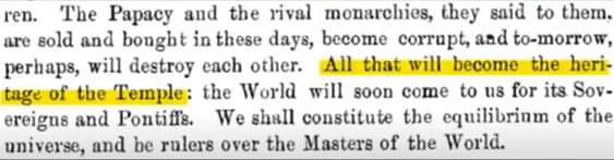The Papacy and the rival monarchies, they said to them, are sold and bought in these days, become corrupt, and tomorrow, perhaps, will destroy each other. All that will become the heritage of the Temple: the World will son come to us for its Sovereign and Pontiffs. We shall constitute the equilibrium of the universe, and be rulers over the Masters of the World.